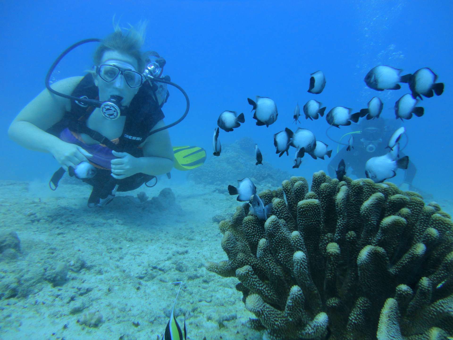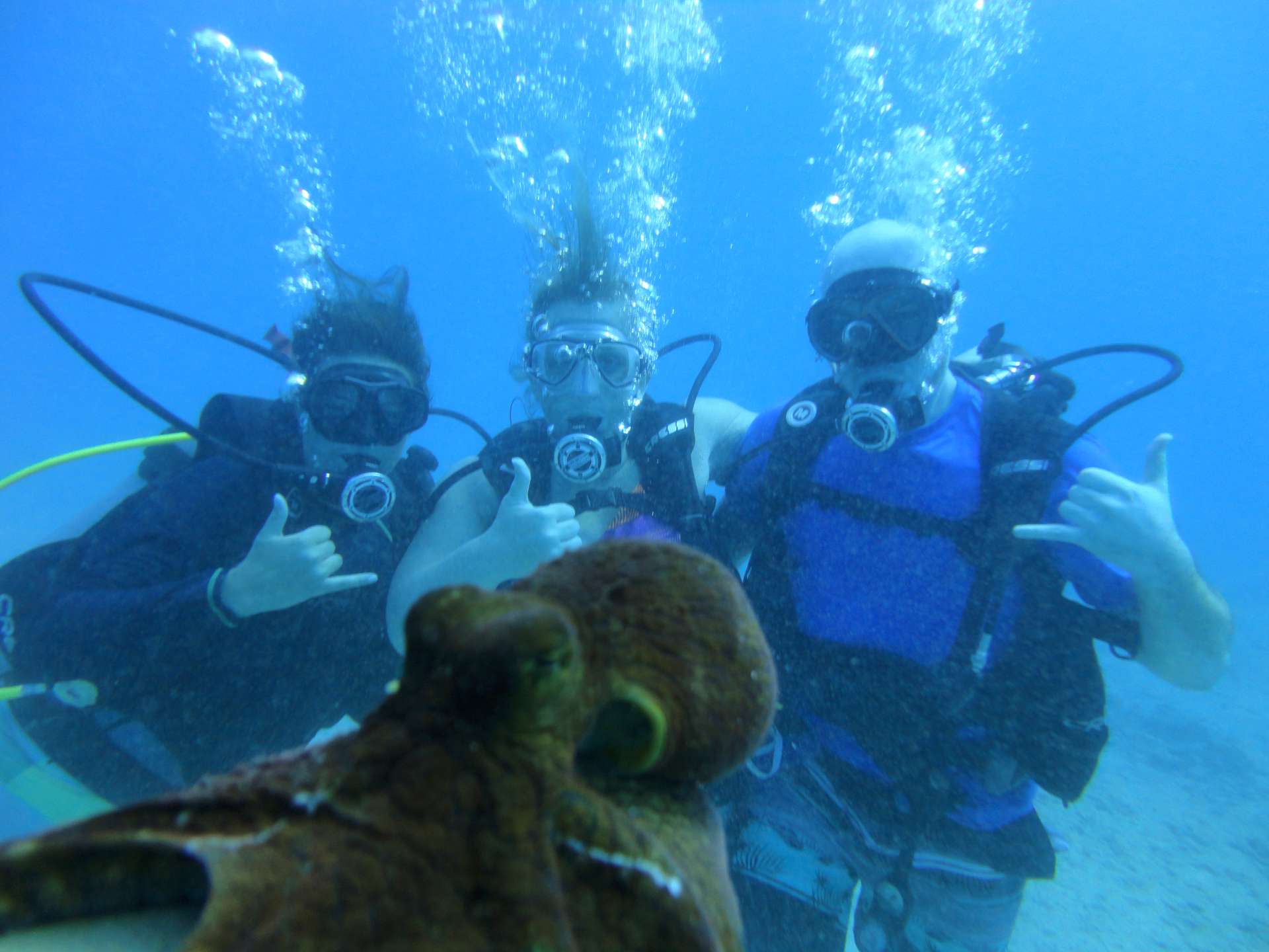 With some experience from the first dive we decided to venture a little further out to encounter more turtles. Upon reaching the outer reef we became surrounded by numerous Hawaiian green sea turtles! They are absolutely magnificent to see underwater about the reef. Then suddenly and most noteworthy out of the reef came a white tip reef shark! If all that wasn't enough on this dive we then seen a immense octopus.